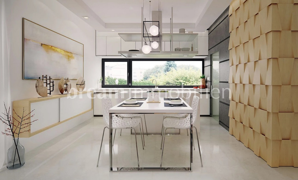 Enjoy your meals in a bright and spacious dining area that is ideal for sociable evenings. The adjoining living area is the perfect place to relax. Large windows provide plenty of natural light and create a pleasant living atmosphere.