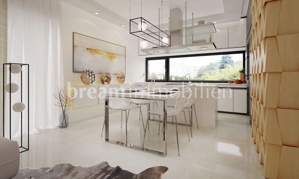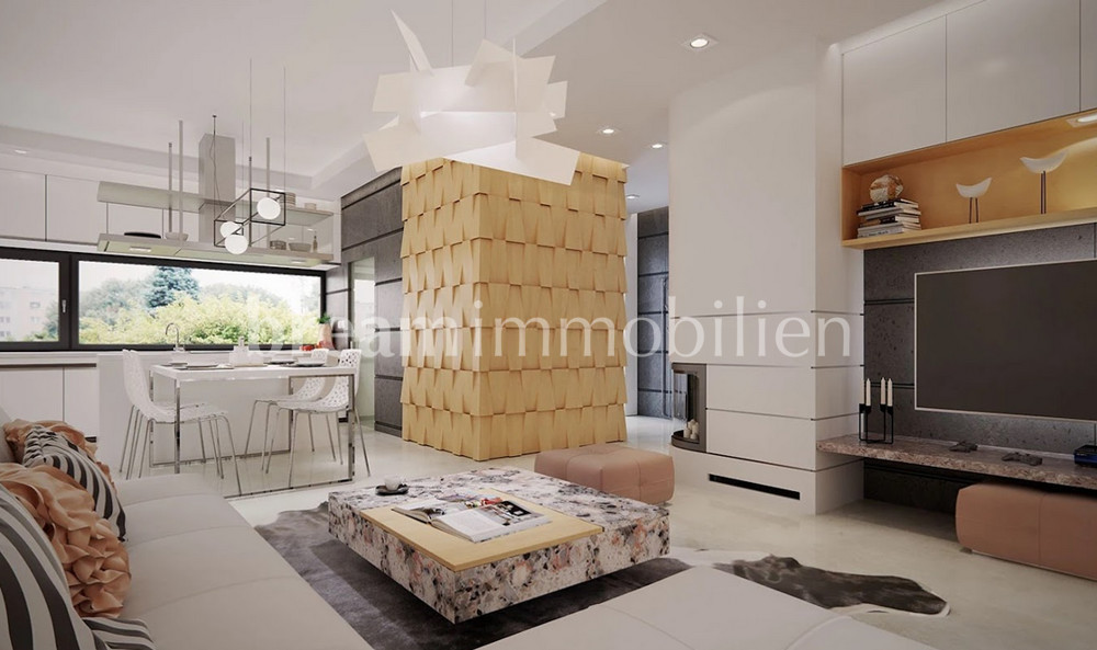 On the first floor, you enter the house through a bright and inviting entrance area, which immediately creates a warm atmosphere. At the heart of the house is the high-quality open-plan Nobilia eat-in kitchen, equipped with first-class branded built-in appliances. Here you can conjure up culinary delights while spending time with family and friends. The open-plan design creates flowing transitions to the dining and living area.