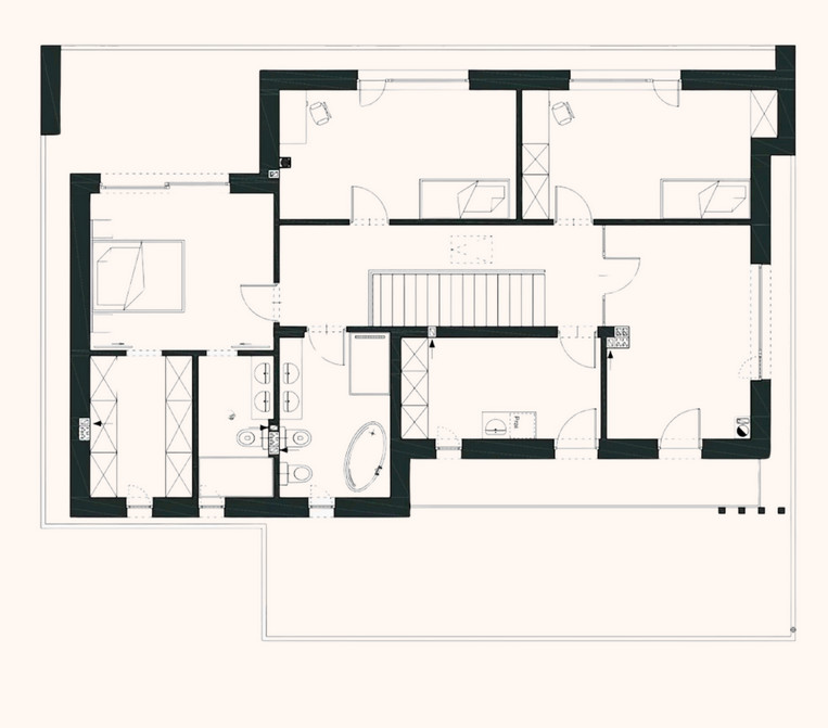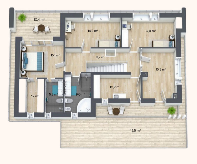 There are two further bedrooms on the upper floor, which are connected by an open gallery. These rooms are ideal for children, guests or as an office. Another stylish bathroom complements the bedrooms and offers additional comfort.