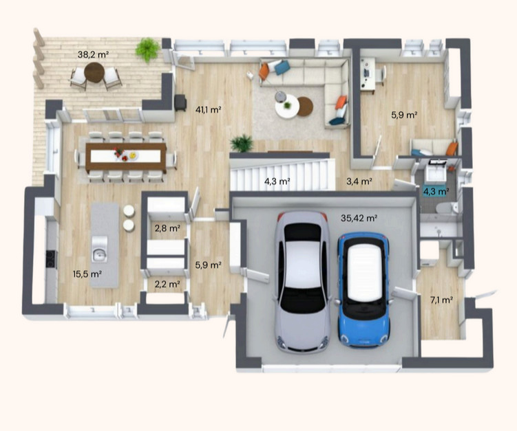 High-quality materials and intelligent construction contribute to a pleasant indoor climate and low emissions. This house model is the ideal place for families and couples who value modern quality of life, functionality and sustainability. The villa complies with energy efficiency house standard 40. This offer includes the base plate, connections, building rights and an energy certificate. This is an example house, the floor plans can be individually changed and adapted. Usable area: 239.61 sqm, living area: 197.08 sqm