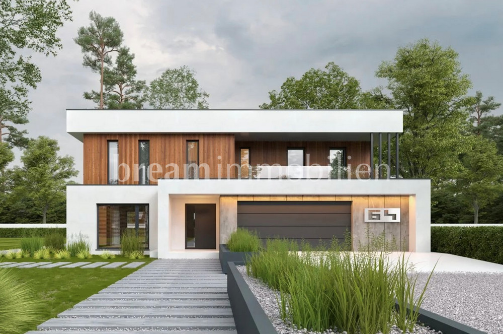 On offer here is a fantastic building plot of over 2,200 square meters. Development is possible according to the development plan. The plot has a south-west orientation, is rectangular and has a GRZ 0.2 / GFZ 0.3. Electricity, gas, water supply, sewage and telephone are connected to the street. We are offering you an ultra-modern, energy-efficient detached house in solid modular construction. The house realizes your dream of owning your own home at this location promptly and at good price conditions. This spacious and well thought-out property combines modern design with high-quality fittings and sustainable technology. The house extends over two levels and offers you a total living space of almost 200 sqm, with both functional and cozy living spaces.