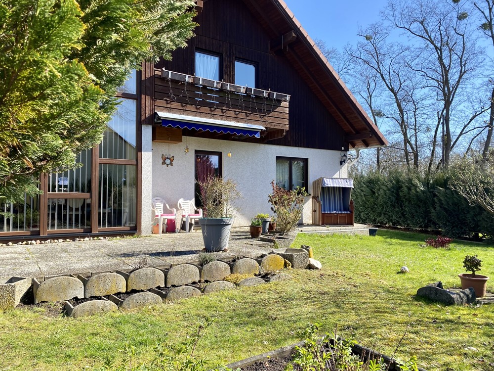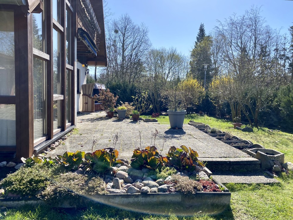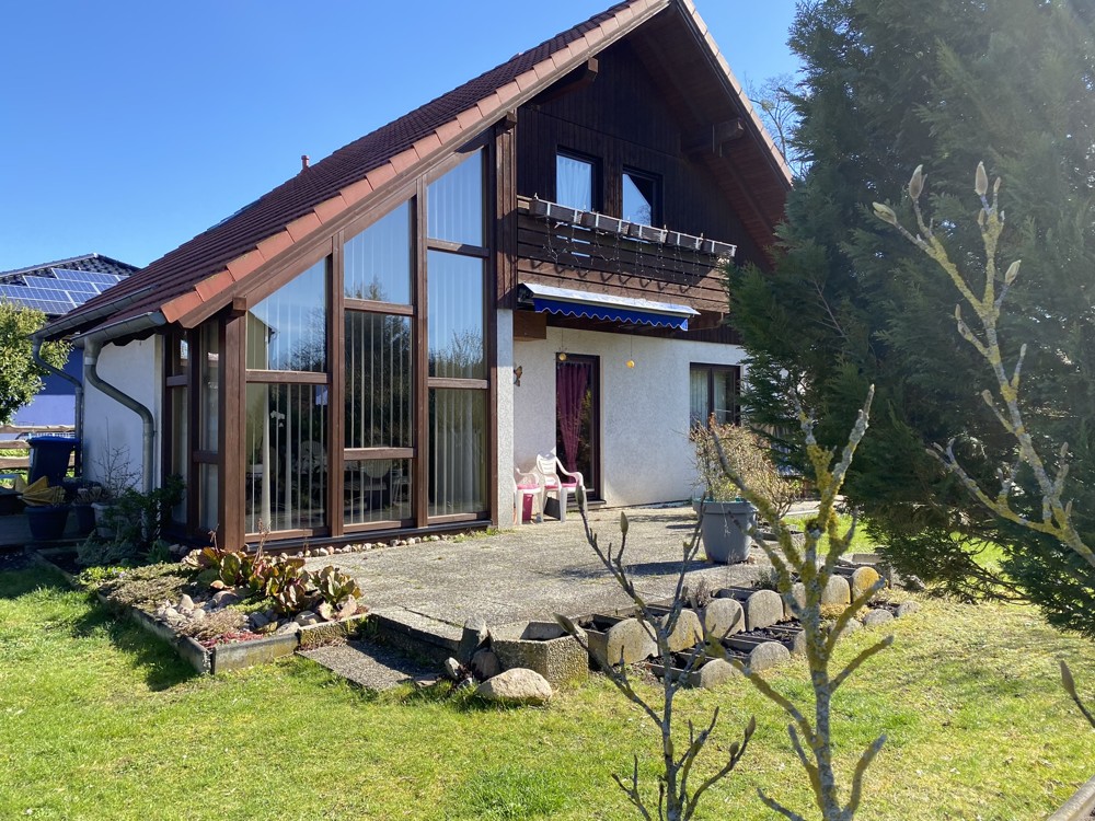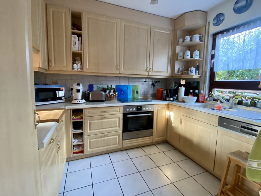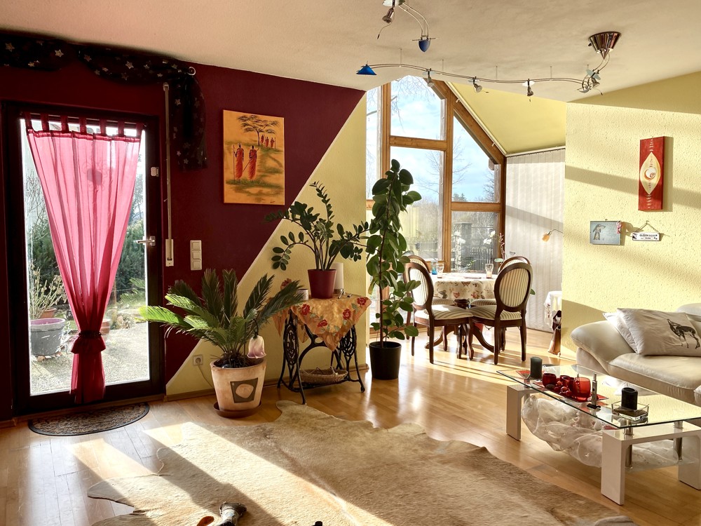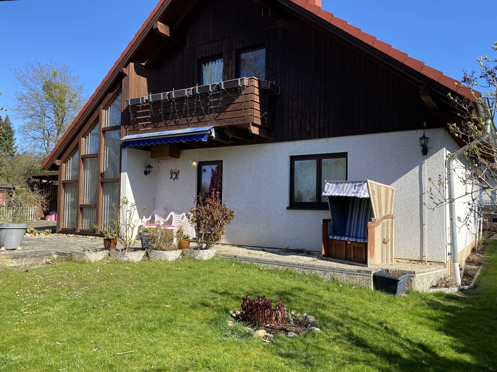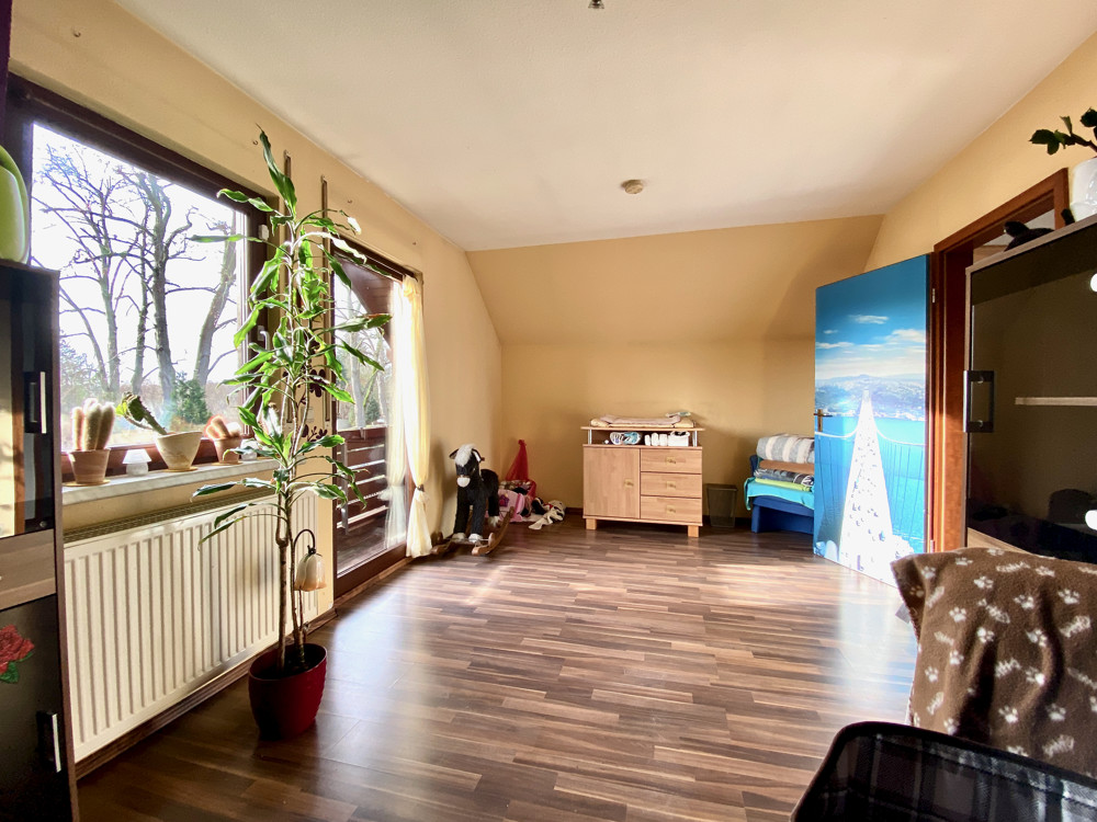 The well-maintained detached house presents itself very spacious, bright and family-friendly and has a full basement. It was built in 1995 in timber frame construction as a modern ExNorm prefabricated house. On the first floor you will find the spacious living-dining room with access to the approx. 20sqm southwest terrace and garden, a separate kitchen, two bedrooms and a daylight shower bathroom. A highlight in the living-dining room is the bay window with the large glass front, which provides a view of the greenery and the surrounding area. The separate kitchen is equipped with a fitted kitchen and a hatch to the living-dining room, but can also be connected to it by simple construction measures. A rectangular entrance hall offers enough space for a wardrobe and storage for the whole family. A comfortable wooden staircase leads to the upper floor. There are two more bedrooms, one even with a sunny southwest-facing balcony and views of the greenery. In addition, a large daylight bath and storage space in the knee floor in the hallway.