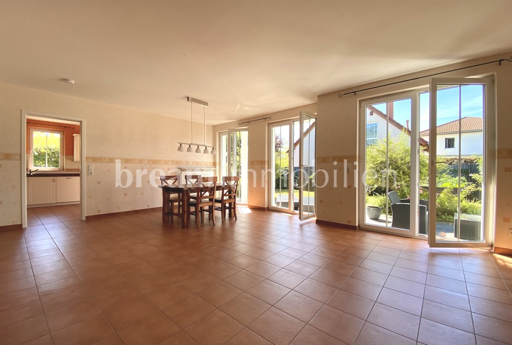 - großes Wohnzimmer mit drei Terrassentüren zur Südwest-Terrasse und zum Garten,