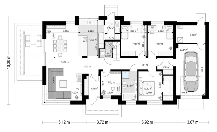 Beim Betreten des Hauses werden Sie von einem großzügigen Eingangsbereich empfangen, der direkt in einen offenen, lichtdurchfluteten Flur führt. Zur linken Seite finden Sie den geräumigen Wohnbereich, der mit einer Fläche von 35,08 m² ideal für gemütliche Abende mit der Familie ist. Große Fenster lassen viel Tageslicht herein und bieten Zugang zur weitläufigen Terrasse, auf der Sie entspannte Stunden im Freien verbringen können.