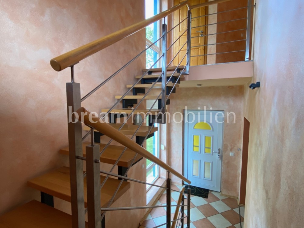 Das helle Treppenhaus mit zweitem Eingang schafft Raum für verschiedene Lebenskonzepte, z.B. als Mehrgenerationenhaus.