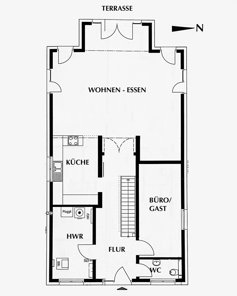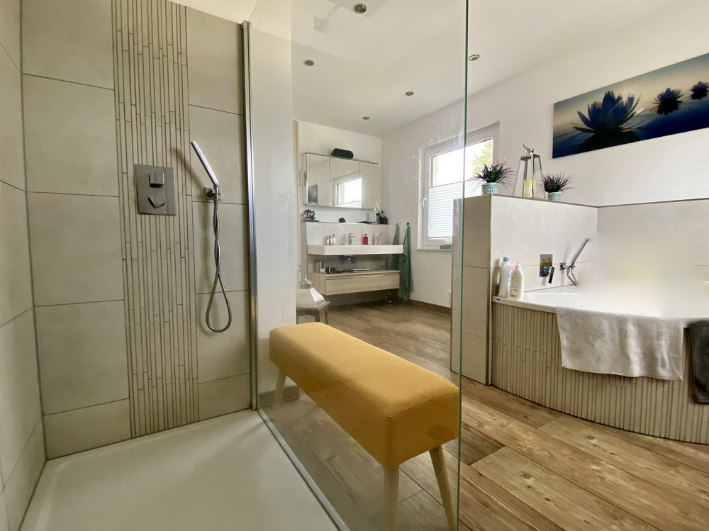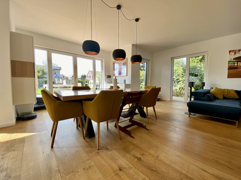 Über die Einfahrt betritt man im Ergeschoss den zentralen Flur mit ausreichend Platz für die Garderobe. Wohnlicher Sandsteinboden und eine moderne Holztreppe nach oben verströmen schon gleich beim Betreten des Hauses viel Wohnlichkeit und Behaglichkeit. Vom Flur gehen seitlich ein ruhiges Büro- oder Gäste-Zimmer, ein Gäste-WC mit venezianischen Fliesen, der Hauswirtschafts- und Heizungsraum sowie die zum Wohnbereich offene Küche ab. Geradezu betritt man über eine einladende Flügeltür den großzügigen Wohn-Essbereich mit Zugang zur ca. 78qm großen Terrasse. Alle Fenster sind bodentief als Türen zum Garten angelegt. Der ganze Wohnbereich wurde mit einem strapazierfähigen Eichendielenparkett im Landhausstil verlegt. Die Kücheneinbauten und elektrischen Geräte werden höchsten Ansprüchen und familiengerechten Abläufen gerecht: eine eingebaute Kaffeemaschine, Mikrowelle, Dampfgarer, Induktionsherd, eine große Wärmeschublade sowie ein Wasseranschluss für den Kühlschrank mit Eismaschine und ein hocheffizienter Dampfabzug erleichtern den Alltag.