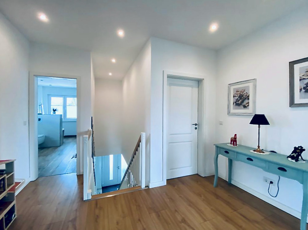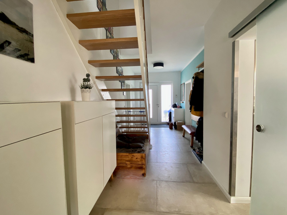 - großzügiger Eingangsbereich mit Holztreppe nach oben,