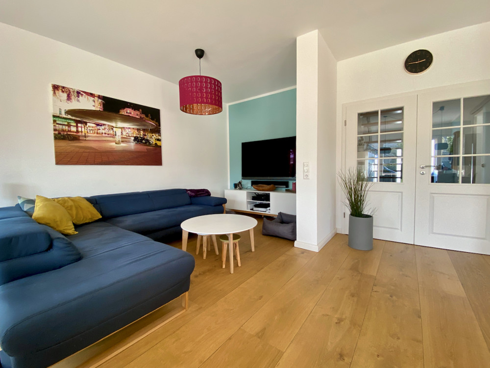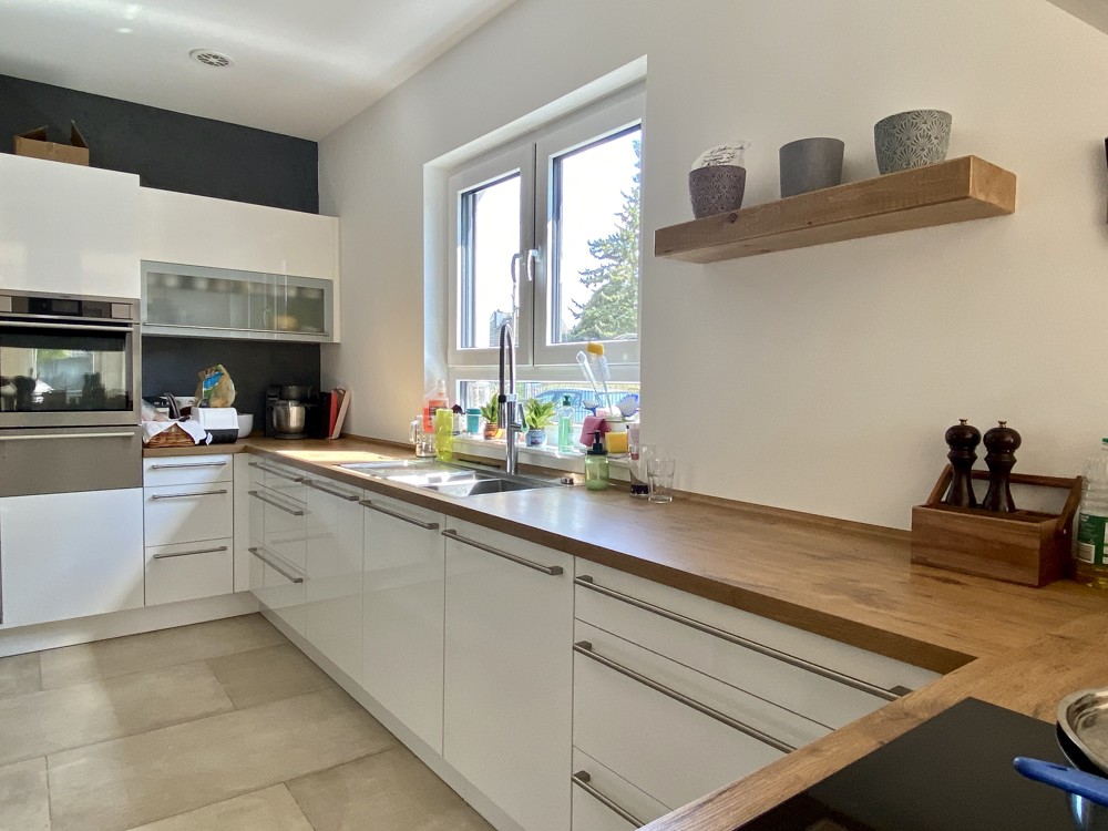 - Wohn-Essbereich mit Eichendielenparkett und offener, sehr gut ausgestatteter Küche mit hochwertigen Geräten und Abzug,