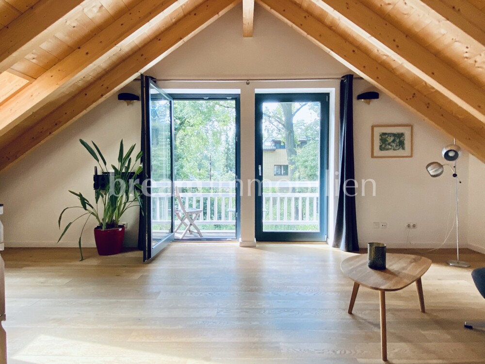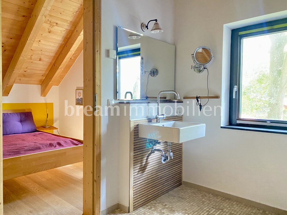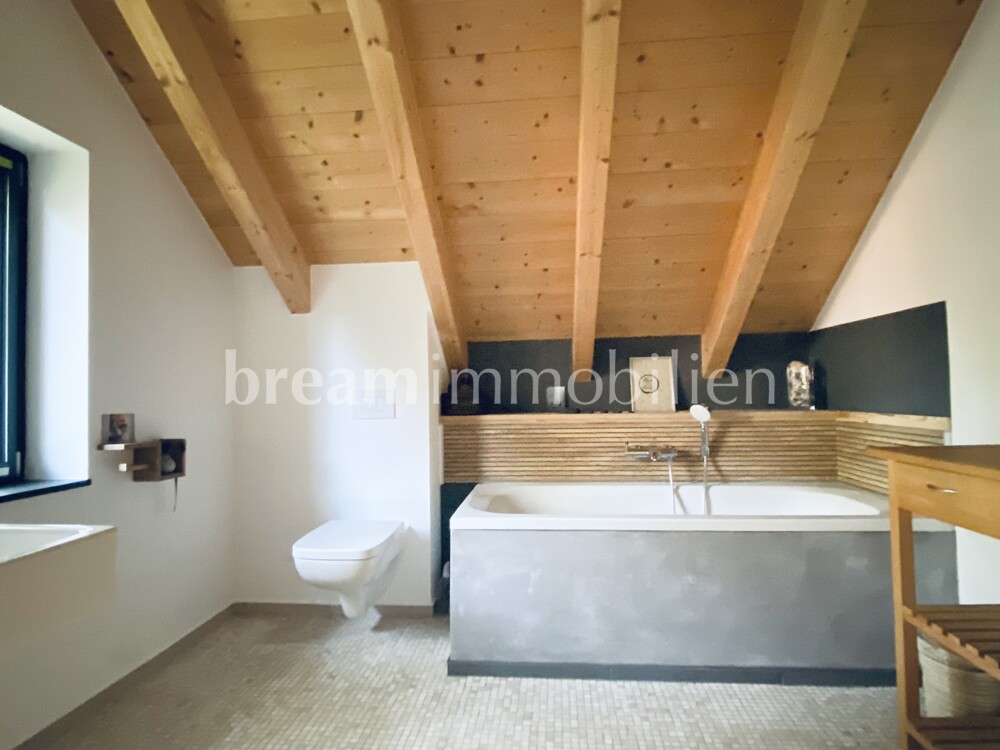 Eine Vollholztreppe führt ins Dachgeschoss. Dieses ist offen gestaltet und überzeugt beim Betreten als erstes durch den wohnlichen, offenen Dachraum mit Zugang zu dem überdachten Balkon mit herrlichem Blick in den Garten. Ergänzt wird die Etage durch ein gemütliches Schlafzimmer mit neuwertigem Ensuite-Tageslichtbad mit Wanne sowie einem begehbaren Ankleideschrank.