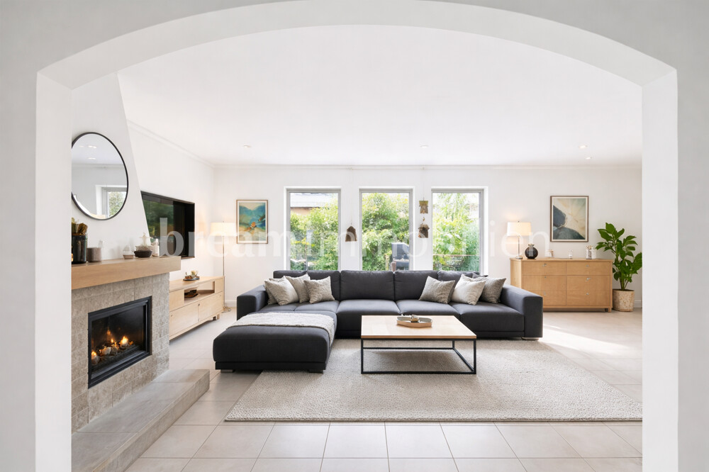 - sehr freundlicher, großer Wohnraum mit Kaminofen, 3 großen, bodentiefen Fenstern,