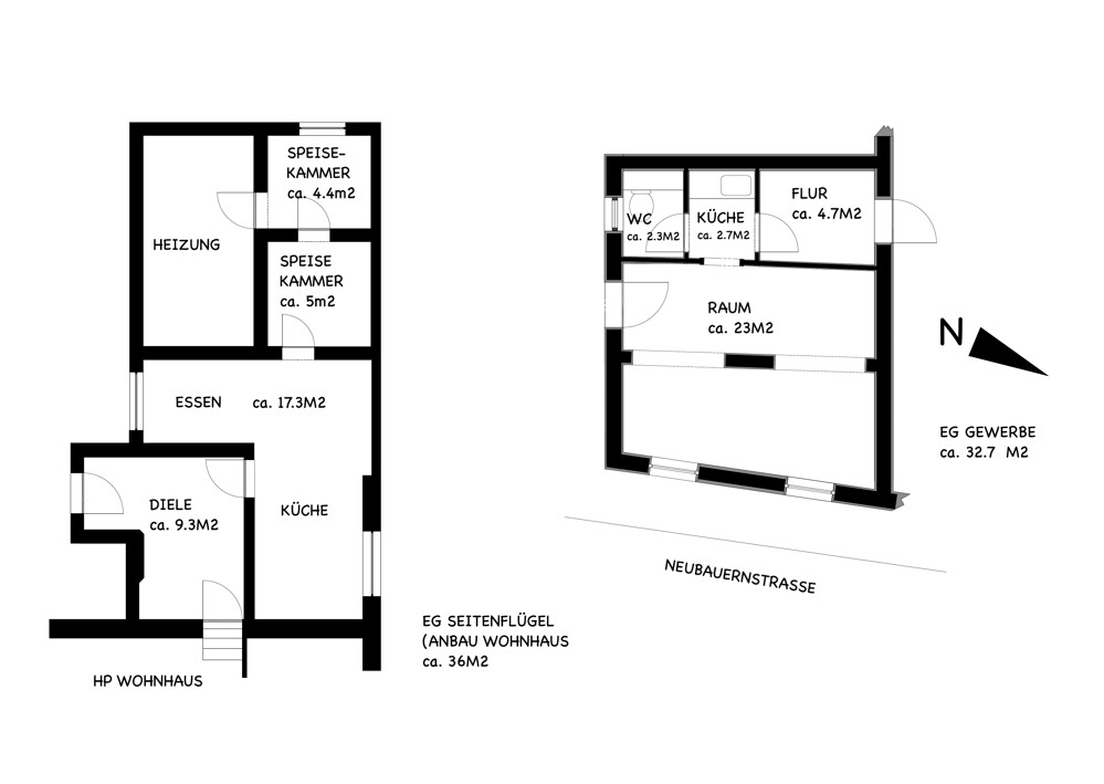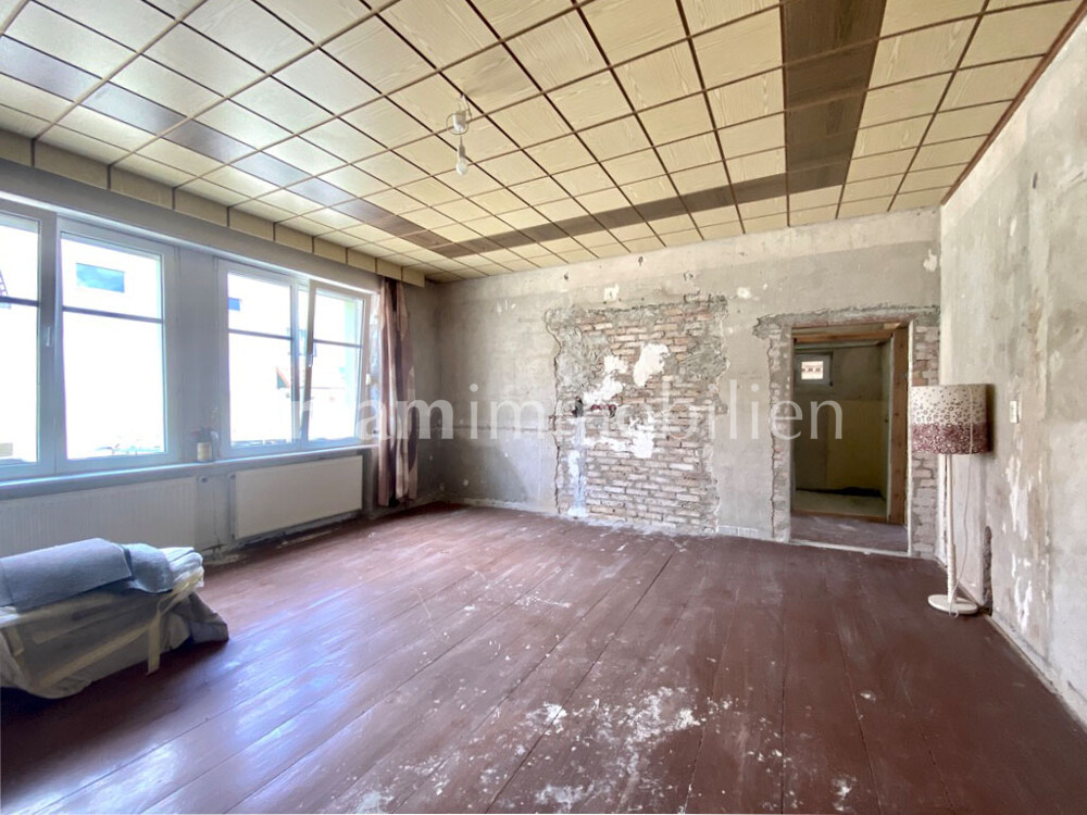 - Flur, Pantryküche, WC, großer Raum mit Fenster zur Straße,