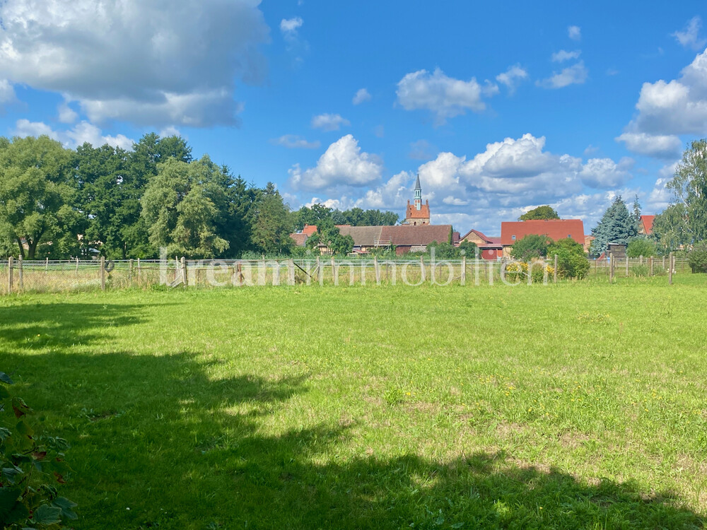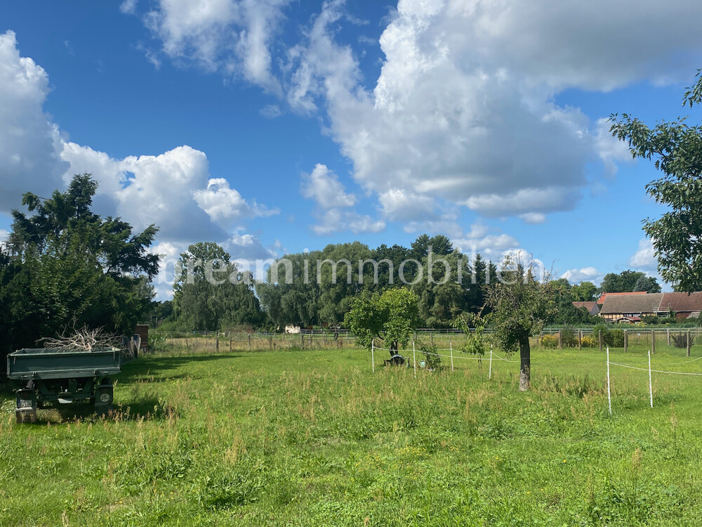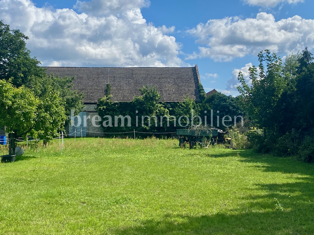 Das Grundstück umfasst ca. 3.600 m². Das Gartenland hinter dem Vierseitenhof besteht größtenteils aus Wiese und ein paar Obstbäumen. Der Weitblick über die Felder mit Blick auf den Dorfkern mit Kirche ist sehr idyllisch und lädt zum Entspannen, Gärtnern oder zur Tierhaltung ein.
